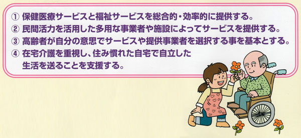 介護保険の基本方針を可能とするためには、高齢者のニーズ(求めている事、必要としている事がら等)を十分に把握した上で、介護保険のサービスの種類や内容、提供する事業者などの情報を提供して、高齢者及びその家族が選択できるようにする必要があります。