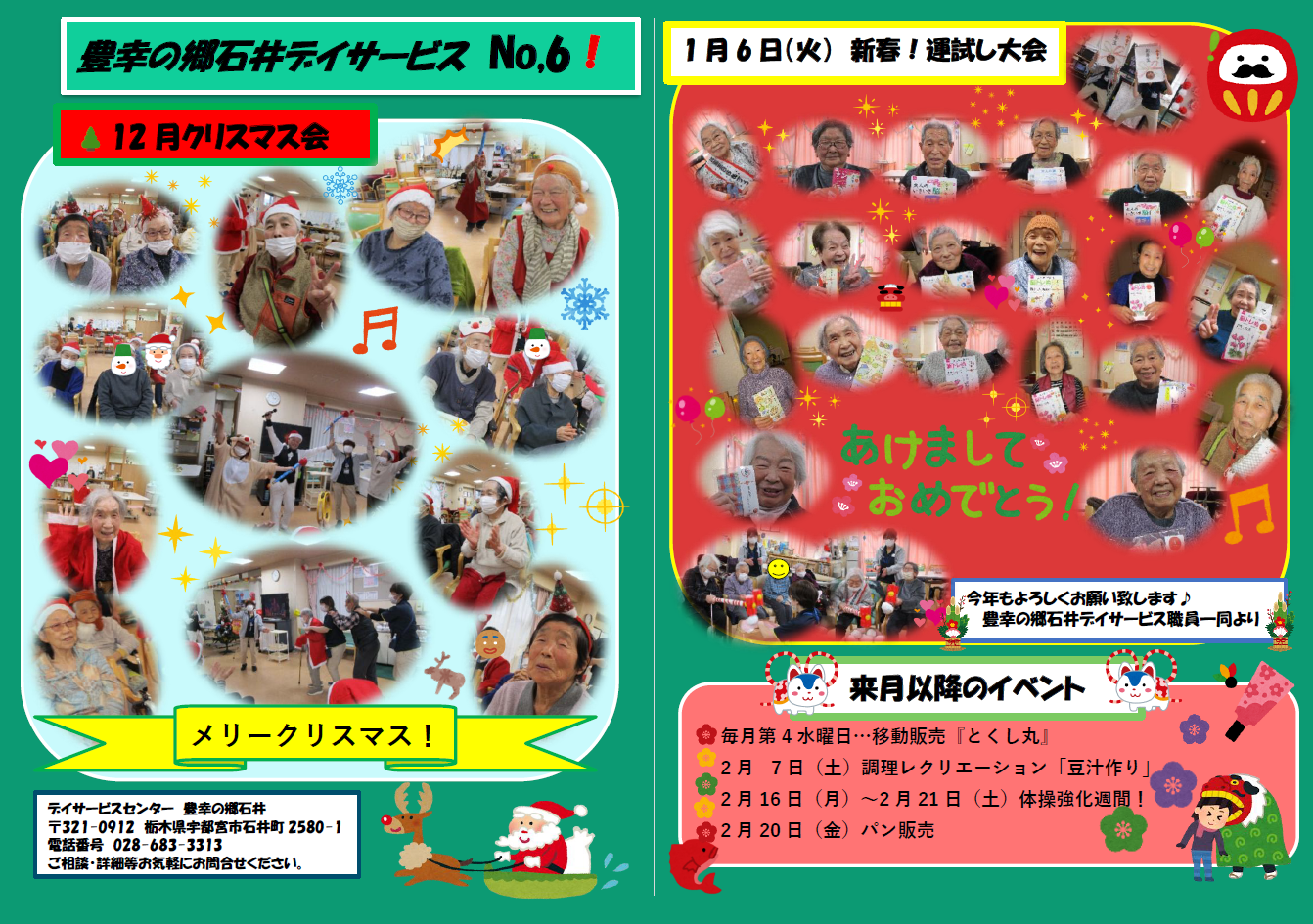 機能訓練では、ご利用者の皆様に合わせた個別機能訓練メニューの作成・実施・評価を行い、生活の中で必要となる筋力をはじめとする動作などの訓練を職員と一緒に行っております。 楽しむことも大切なことと認識し、レクリェーションでは選択制を取り入れております。レクリェーション内容につきましては、運動系・文化系・農耕系と、どれを取っても楽しく参加できるメニューを用意しております。 また、野外レクリェーションとして職員と一緒に外出し、季節の移り変わりや思い出の場所を訪ね、楽しいひとときを過ごしていただくとともに、心のやすらぎや昔を回想していただき、認知症予防・進行防止を図っております。 皆様もぜひ、豊幸の郷石井デイサービスをご利用になってみては、いかがでしょうか。 きっといきいきとした、ご自分らしい生活を見つけていただけると思います。